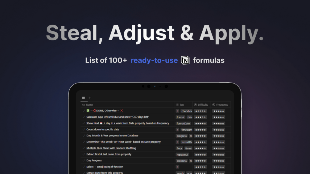 - Collection of 100 + ready-to-use Notion formulas.