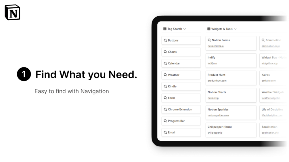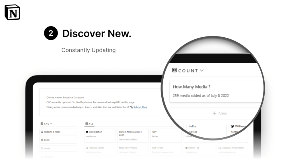 Collections of over 250 Notion resources ranging from widgets to social media accounts.